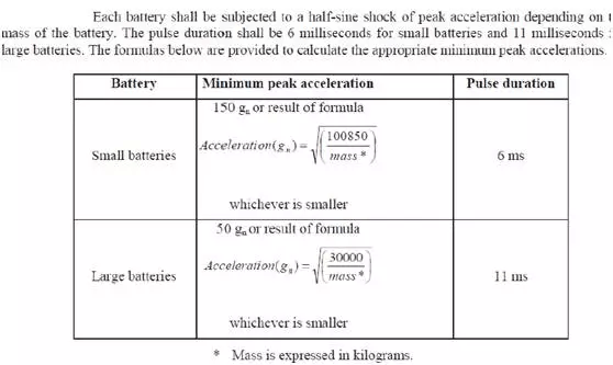 在修订前加速度峰值是固定值:小电池150gn,大电池50gn。而新标准则是制定了公式,根据电池的重量来对应算出加速度并相对应的与150gn和50gn做对比后采用相应的加速度峰值。