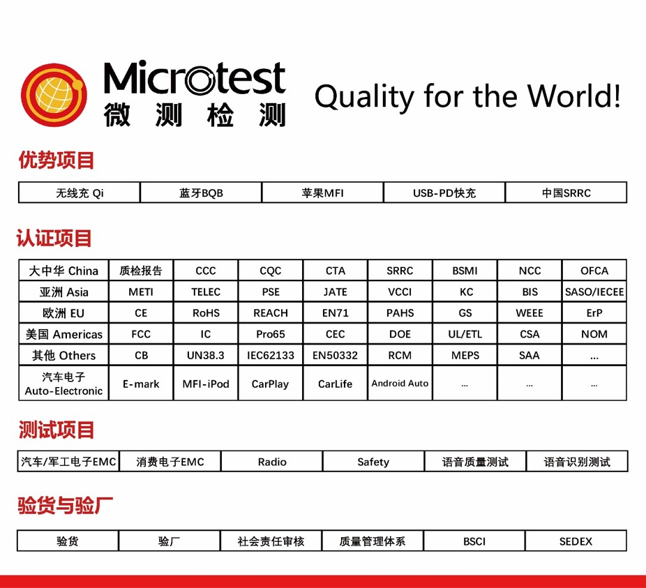 Microtest是国家CNAS、中国计量认证CMA、美国实验室认可协会A2LA、无线充电联盟WPC、蓝牙认证评估委员会SIG、亚马逊Amazon等国际机构的认可实验室。Microtest的使命:让您的产品通全球!